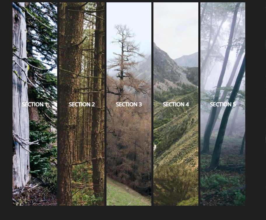 Interactive and animated five section overlay landing page, expands on click to reveal full page scope.
